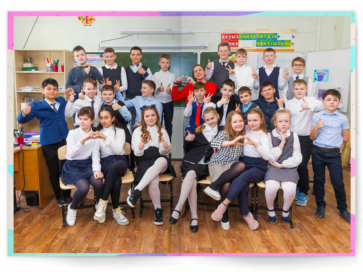• Разворот с общей фотографией всего класса
