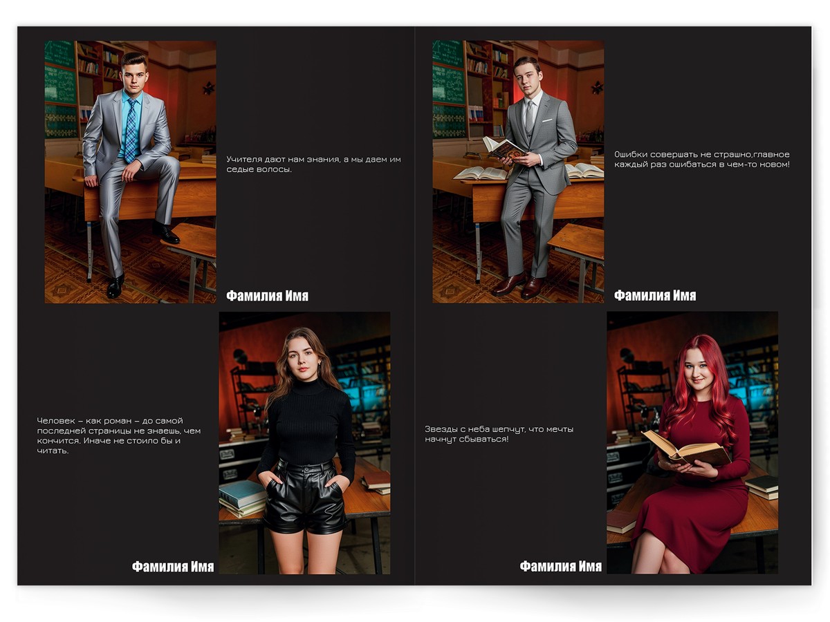 Потому что мы не снимаем «как у всех». Каждый кадр — это маленькое арт-заявление: резкий свет, дерзкие ракурсы, цвет как у лучших fashion-редколлегий. И да — всё это будет снято в вашей школе, а не в студии за три часа езды. Директор не пускает в школу — снимем в студии! Студия оплачивается отдельно.